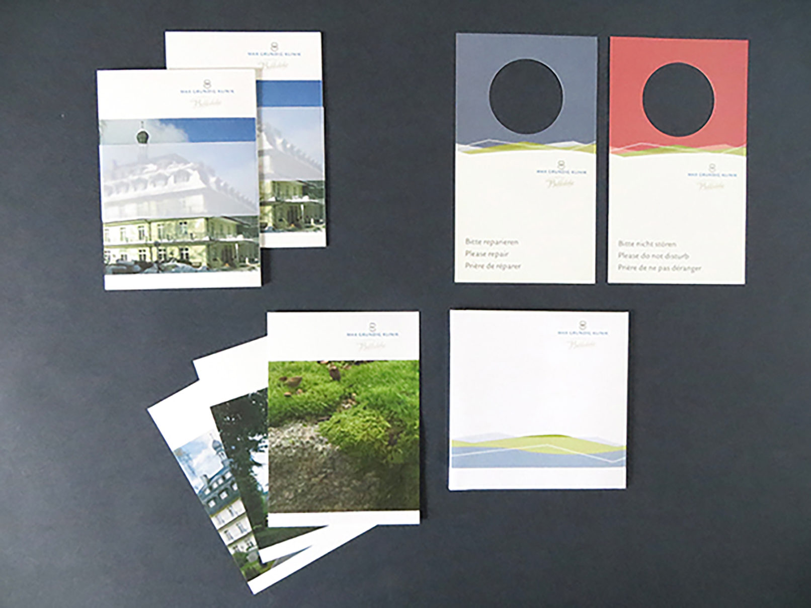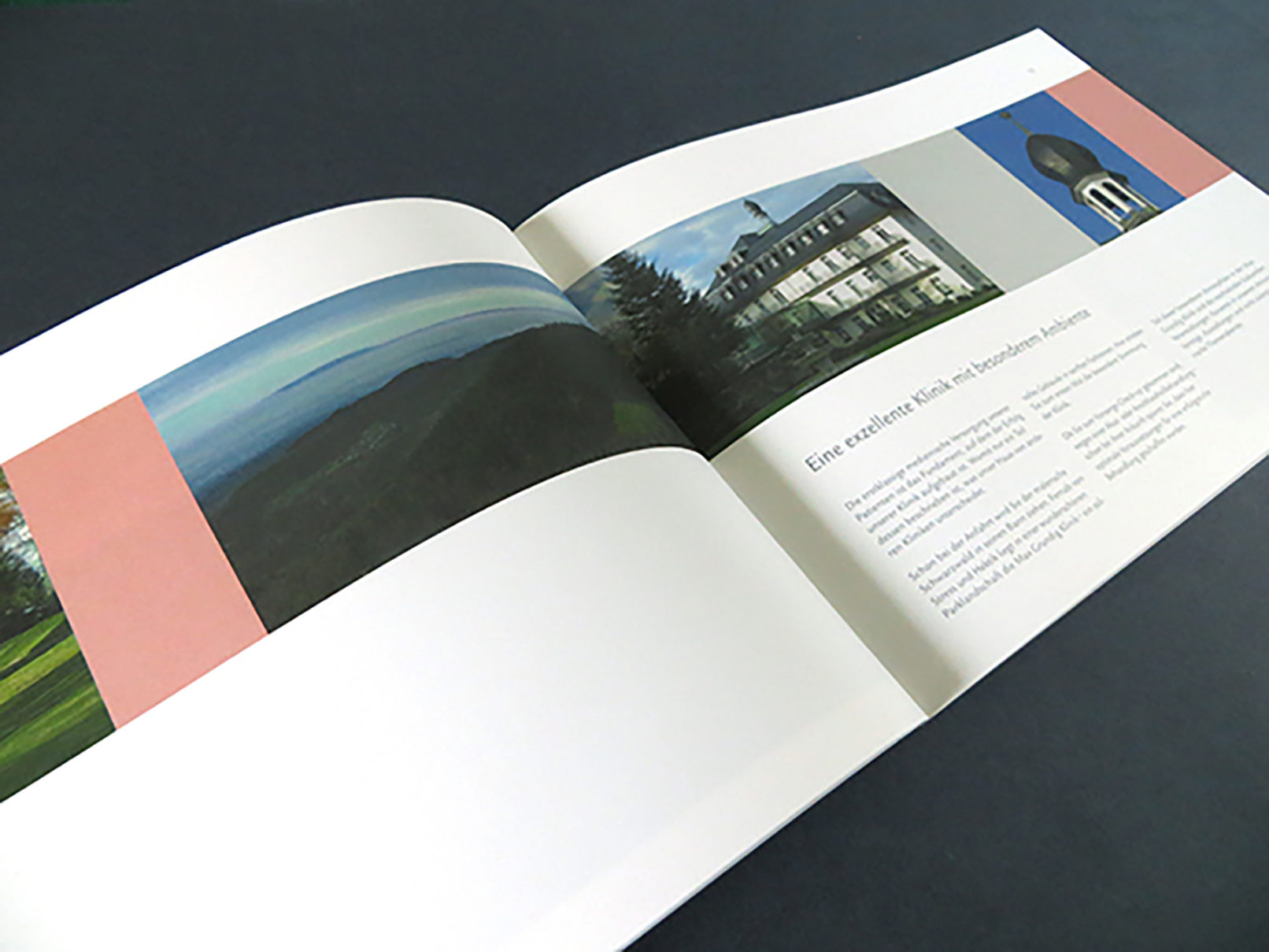 Die Max-Grundig-Klinik auf der Bühlerhöhe im Schwarzwald beauftragte Metadesign mit der Entwicklung eines Corporate Designs. Im Rahmen dessen wurde eine Image-Broschüre entwickelt, deren Gestaltung ich übernahm. In dieser kamen die neuen Elemente wie Bild- und Formsprache zur Anwendung. Weitere Anwendungen waren Postkarten und Türschilder. Das Design präsentiert die Klinik als exklusiven Ort, wo anspruchsvoller Medizin mit dem Ambiente eines Spitzenhotels ergänzt wird.
